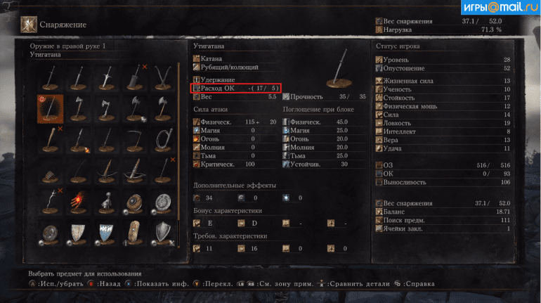 Один из ключевых параметров вашего оружия заключается в затрате ОК. Многое оружие требует затраты очков магии, в результате чего нужно обдумывать каждую особую атаку, чтобы в ключевой момент не остаться с пустой полоской магии. Данную характеристику вы можете посмотреть в параметре «Расход ОК 1(2/3)». Цифры, конечно же, для каждого оружия разные, а то и вовсе отсутствуют.