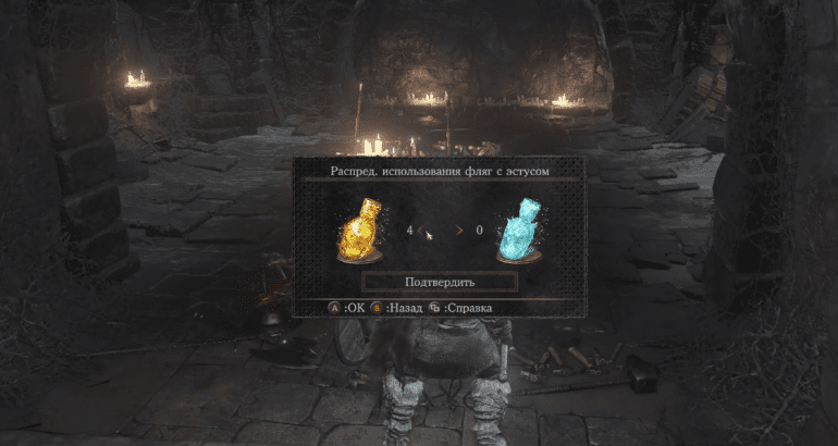 Если вы не поговорите с кузнецом в храме огня или быстро прослушаете все диалоги, то можете упустить важную деталь о флягах. Уже в начале игры вы познакомитесь с обычной флягой с эстусом, которая восполняет здоровье, и пепельной, необходимой для ОК. Вы можете менять соотношение фляг, а то и вовсе убрать определенный вид. Особенного это полезно для тех, кто редко пользуется магией или умениями.