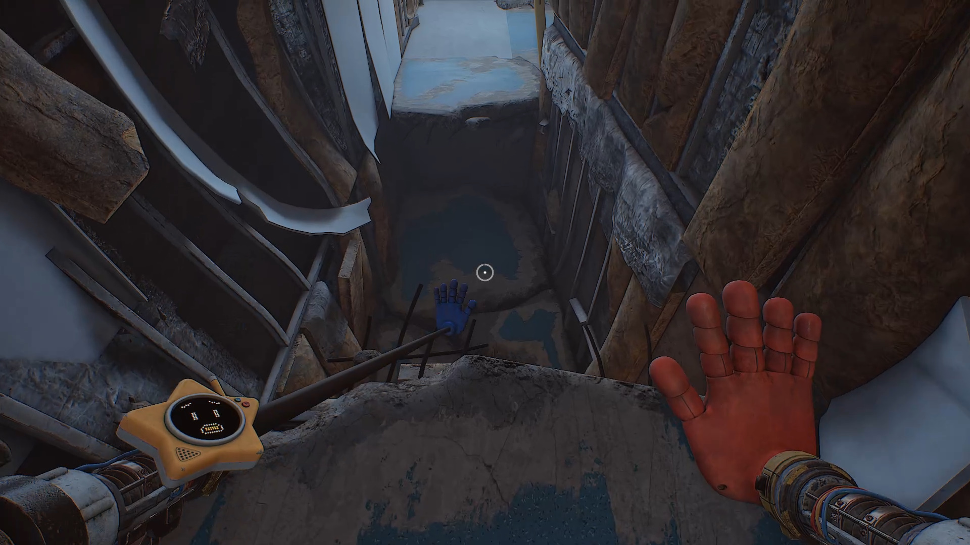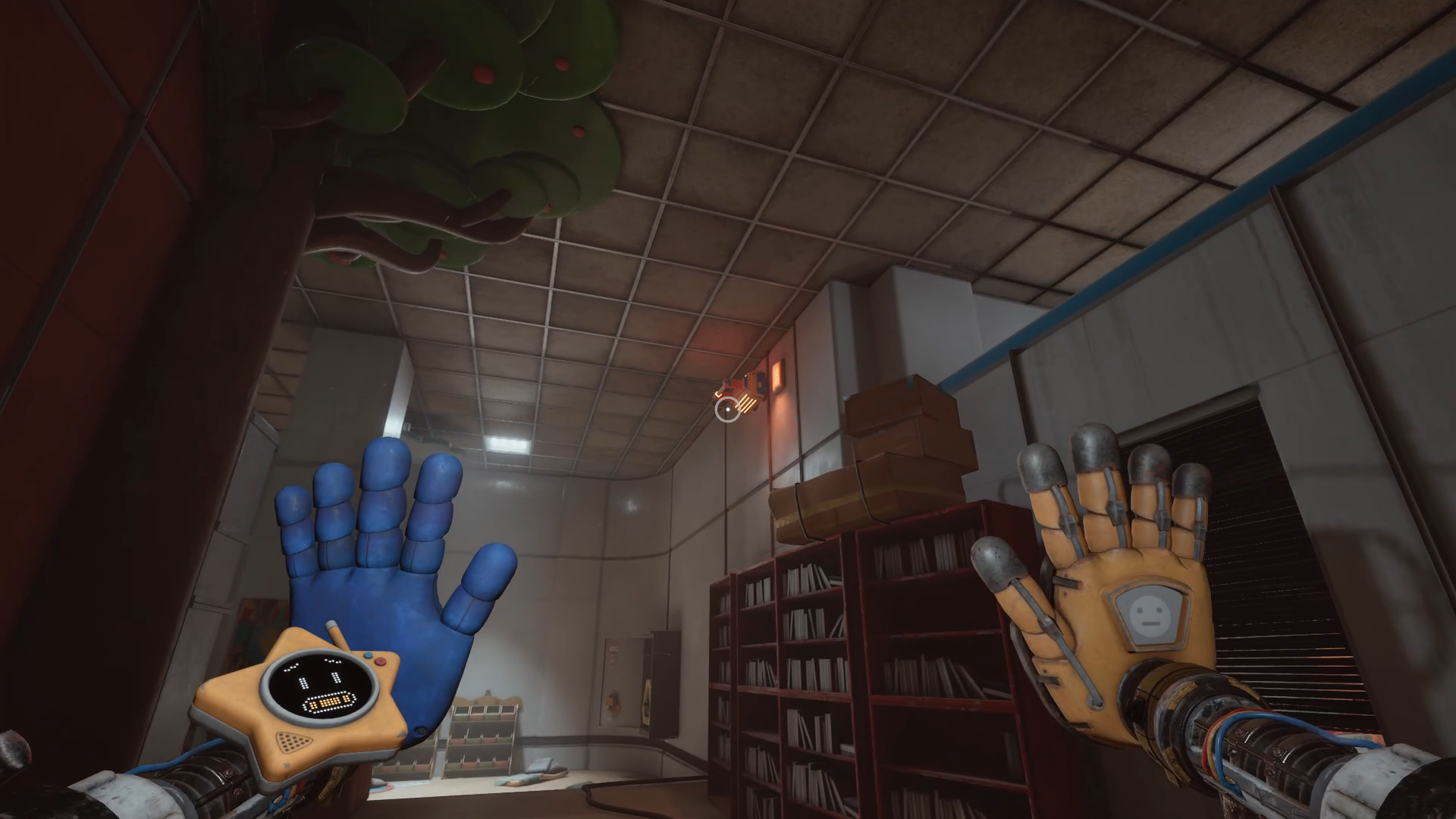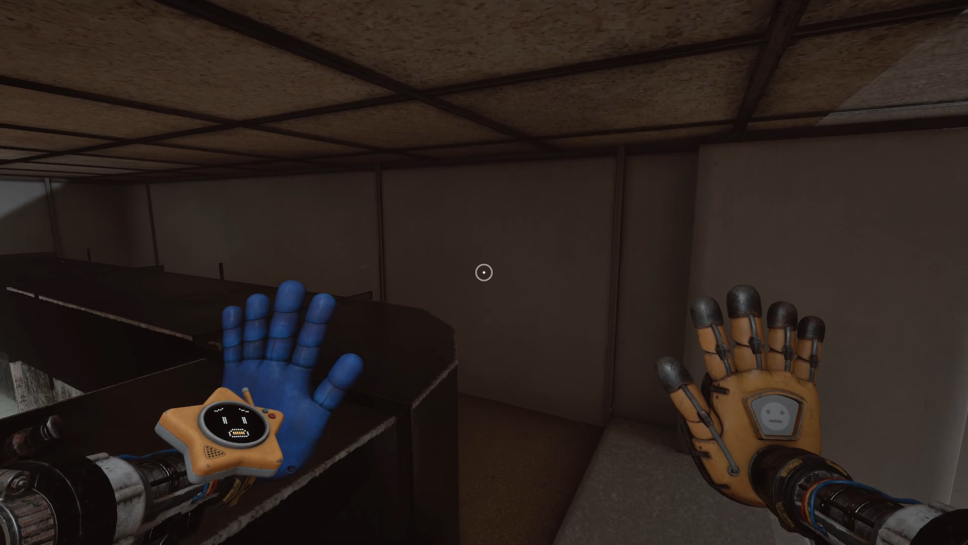 В момент побега от Хагги Вагги, когда вы попадаете в одну из комнат с батарейкой, необходимо притянуться к поручню, чтобы оказаться на крыше кабинета. Там видна вентиляционная решётка, однако нужная панель находится не за ней. Обойдите металлический короб сбоку — именно за ним спрятана синяя кнопка.