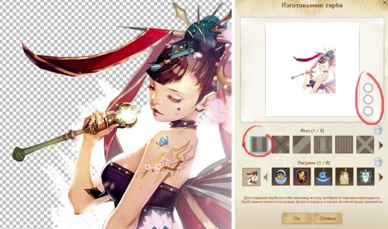 При использовании станка появляется окно изготовления герба. Чтобы сделать шаблон из загруженного рисунка, необходимо нажать по нему в левой нижней части экрана. После этого картинка появится на предпросмотре. Для изготовления шаблона понадобится чернила геральдиста (пять чернил продается в магазине за 130 кристаллов, можно выбить из ларцов, получить во время некоторых событий или купить на аукционе).