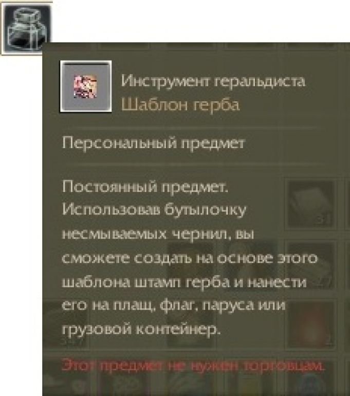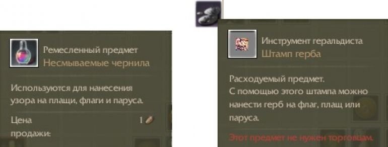 С помощью несмываемых чернил изготавливается штамп герба (пять чернил продаются в магазине за 13 кристаллов). Для этого необходимо нажать правой кнопкой мыши по шаблону герба. Расходуется одна несмываемая чернила, а штамп используется только раз. Штамп наносит свой рисунок на холст, паруса и другое. Для его использования необходимо нажать по штампу правой кнопки мыши, а после по предмету.
