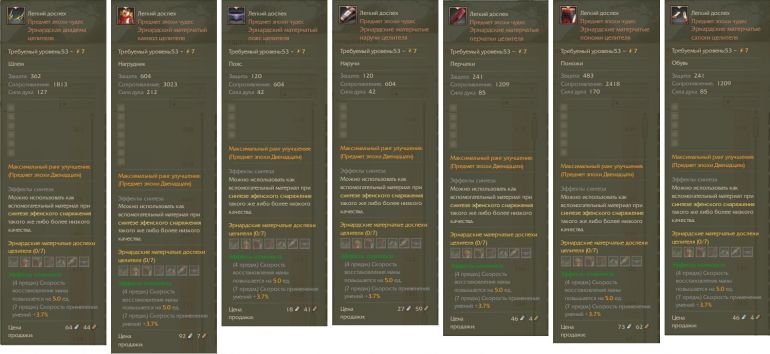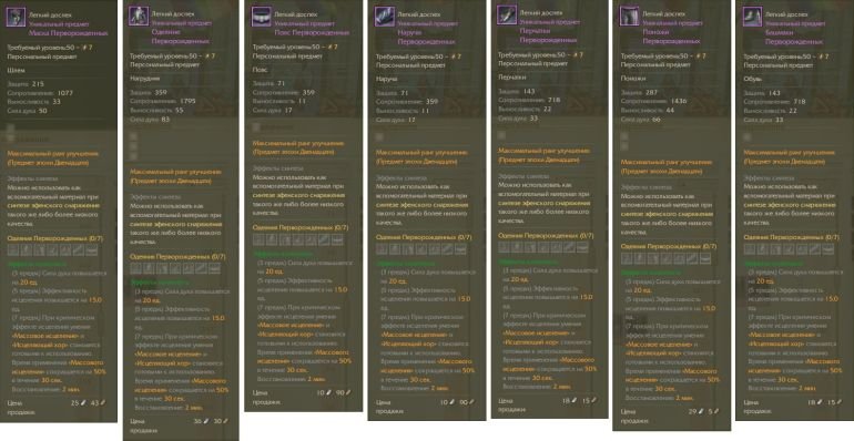 - Легкий комплект целителя на силу духа. Четыре одетых частей снаряжения увеличивают скорость восстановления маны на 5 ед., а весь комплект уменьшает время применения умения на 3.7%.
