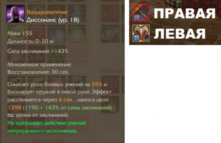 - «Диссонанс» (воодушевление) способен блокировать оружие в левой руке на шесть секунд, тем самым действие щита в это время не работает.