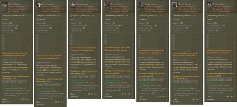 - Легкий комплект хранителя или средний комплект странника на выносливость. Четыре одетых частей снаряжения увеличивают защиту на 546 ед., а весь комплект увеличивает сопротивление на 360 ед.