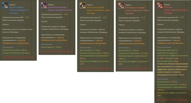 - Серьга хранителя тайны Эрнарда — при использовании повышает вероятность критического эффекта исцеления на 70% на 2 секунды. Увеличивает выносливость на 50 ед. и критический эффект исцеления на 4.5%.