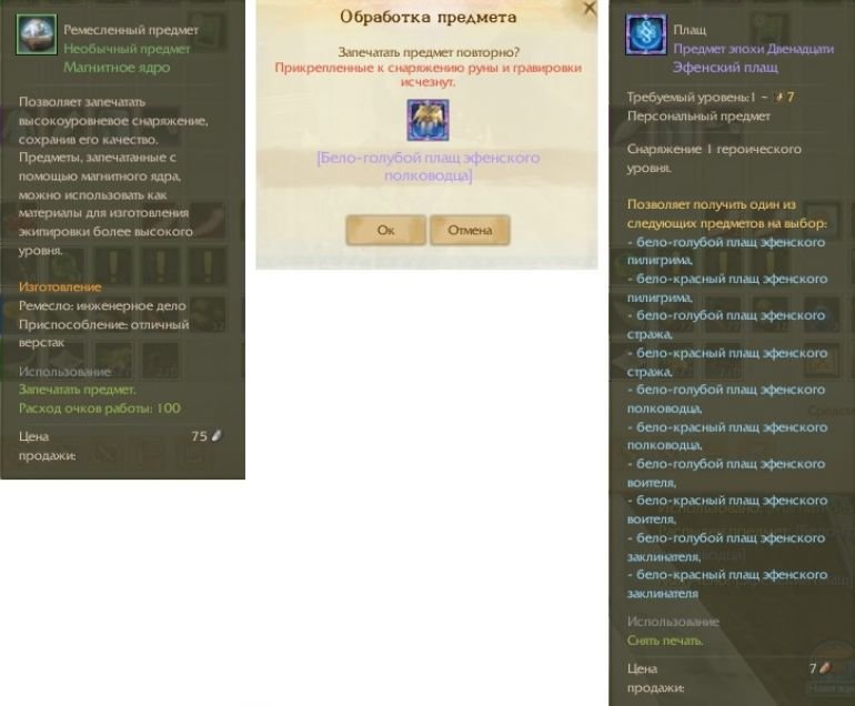 - С помощью магнитного ядра можно запечатывать иферийский/дельфийский/эрнардский/эфенский плащ, при этом сохранится качество, но избыточный опыт синтеза сбросится до нуля, а руна исчезнет. Все характеристики будут также ролиться случайным образом, кроме первой родной.