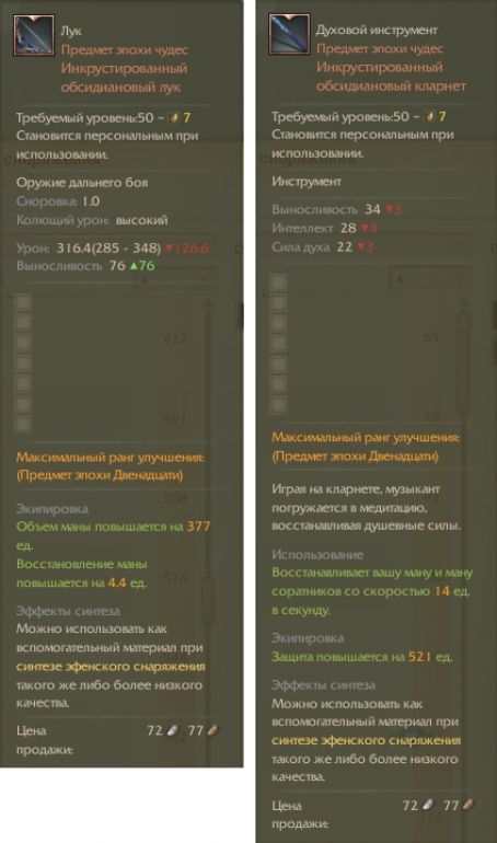 Обсидиановый лук увеличивает количество маны и ее восстановление, а обсидиановый кларнет увеличивает защиту.