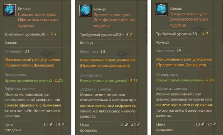 - Иферийское/дельфийское/эрнардское кольцо мудреца — уменьшает время применения умений.