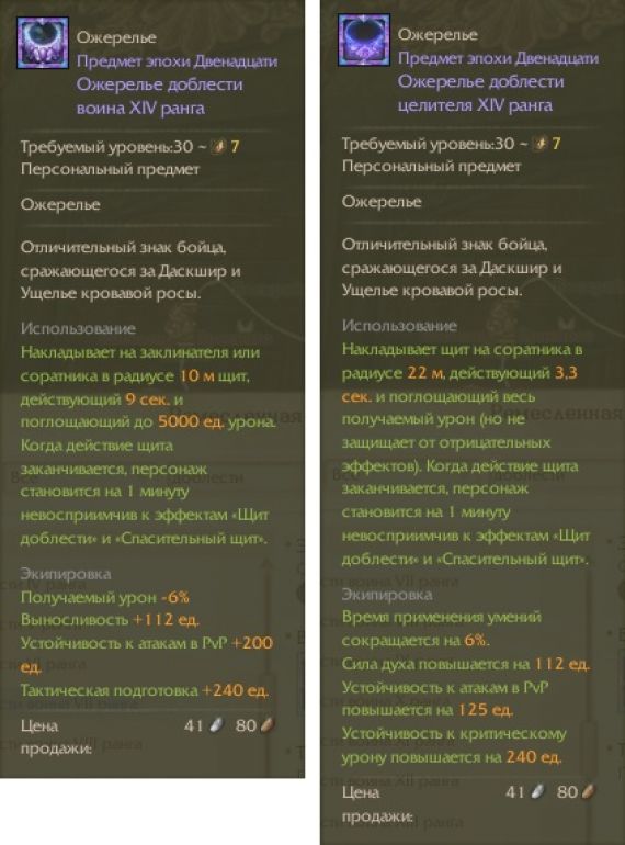 Ожерелье доблести целителя XIV ранга (эпохи Двенадцати) снижает время применения умений на 6%, повышает силу духа на 112 ед., устойчивость к атакам в PvP на 125 ед. и устойчивость к критическому урону на 240 ед. У этого же ожерелья нет лишних характеристик, но увеличивает скорость каста навыков и эффективность исцеления.