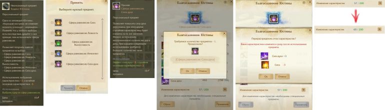 Эти характеристики можно изменять с помощью «Кодекса Юстины» и «Сферы слепого жребия». Кодекс Юстины изготавливается из двух мерцающих алхимических кристаллов и 25 золота на алхимическом кристалле. Из кодекса можно достать сферу равновесия для прокачки одной характеристики на три единицы, но при этом будет выбрана другая случайная характеристика, у которой заберут эти три единицы. Сфера слепого жребия делается из 15 дельфийских звезд и 20 золота. Работает аналогично кодексу Юстины, но характеристика, которой будет дано три единицы будет выбрана тоже случайно. У хилов следует отнимать характеристики у силы и ловкости, так как они необходимы для миликов и луков, а бустить соответственно одну из трех характеристик выше.
