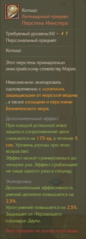 - Перстень Инистера — повышает дополнительную эффективность целителя на 2.5% (можно получить по окончании серии заданий, которая начинается с предмета из последнего босса Воющей бездны «Мусферона»).