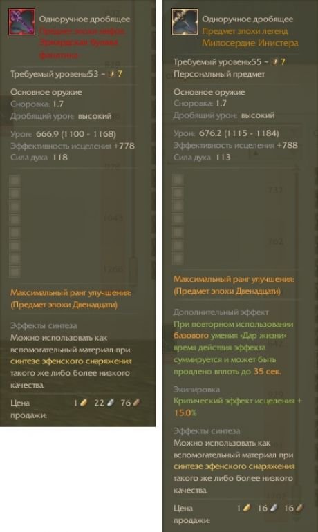 - Эфенский молот — можно сролить силу духа и выносливость, а третьей характеристикой одну из следующих: шанс критического эффекта исцеления, критический эффект исцеления, время применения умений.