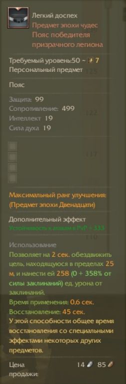 Прибавляет устойчивость к атакам в PvP на 333 ед. и при использовании на панели быстрого доступа обездвиживает человека на 2 секунды. Эффект обездвиживания ничем не снимается, но если вовремя использовать навыки неуязвимости, то можно избежать его. Для создания пояса необходимо всего 30 знаков отваги и полный комплект доспехов с узурпаторов из события «Призрачный легион». Чтобы сделать заготовку для пояса, необходимо создать изумрудный бриолет победителя призрачного легиона и нажать по нему правой кнопкой мыши, но для этого нужно иметь все семь частей доспехов в инвентаре (шлем, доспех, наручи, перчатки, пояс, поножи и сапоги призрачного узурпатора).