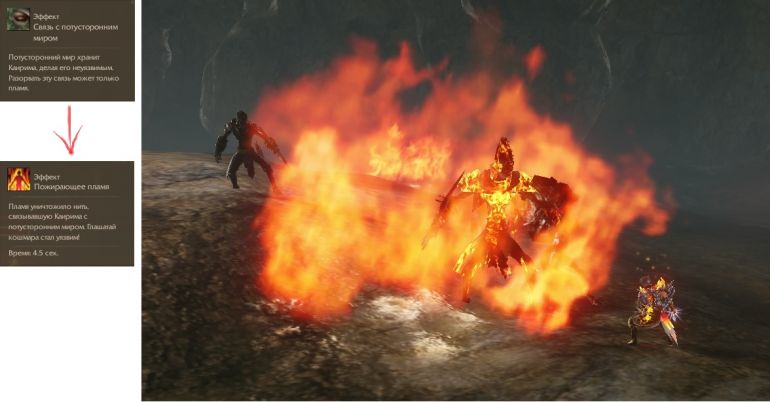 - Стоя в самом огне появляется навык «Бушующее пламя», которое продлевает действие огня на боссе, но отнимая огромное количество здоровья у персонажа. Это огромный риск и следует избегать его случайного использования.