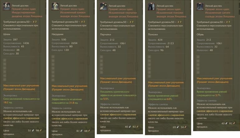 Основной выбор хилов в выборе сета лежит на доспехах Хищника и на обсидиановом оружии, так как дополнительные эффекты никогда не бывают лишними. В эрнардской экипировке нет таких эффектов даже за полный комплект доспехов. В последнюю очередь — это эфенское снаряжение, но берут в основном молот и бижутерию.
