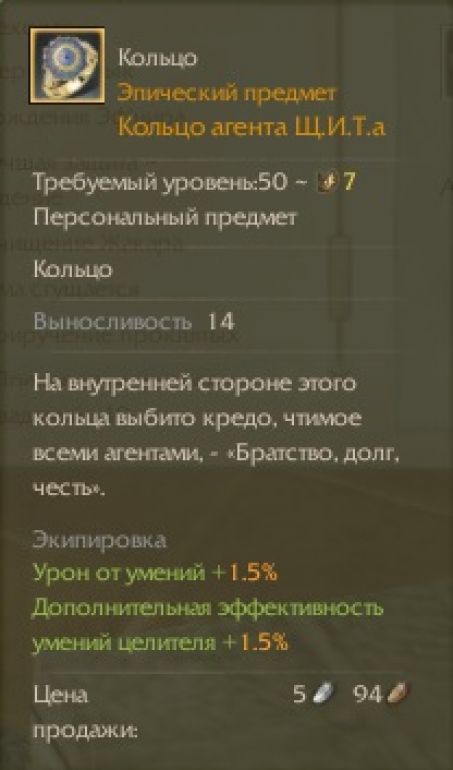 - Кольцо агента Щ.И.Т.а — повышает урон от умений и дополнительную эффективность целителя на 1.5% (можно получить по сюжетной линейке квестов в конце 16 главы).