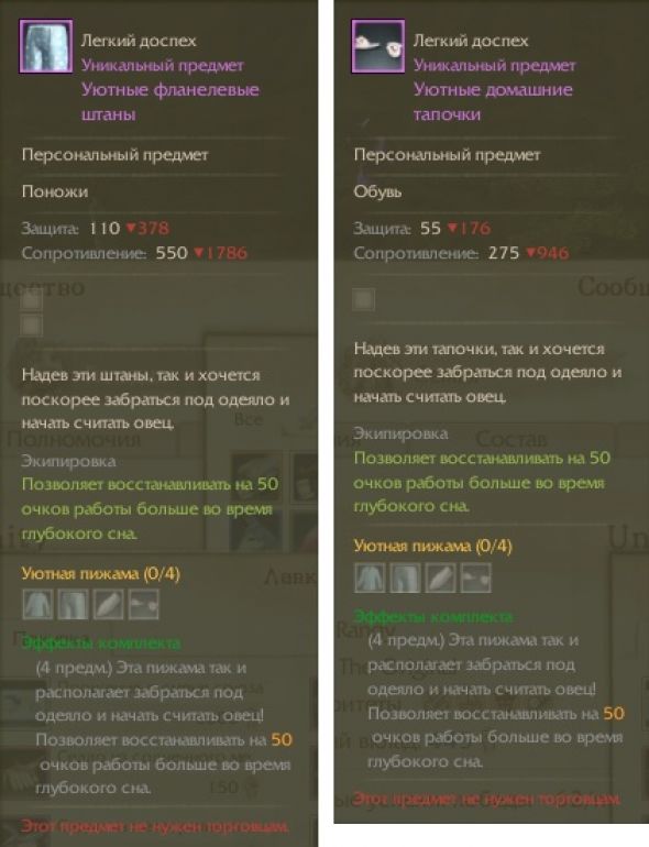 - Фланелевые штаны (250 вклада) и домашние тапочки (150 вклада) — необходимы для большего восстановления очков работы при сне на кровати.