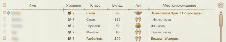 Весь состав гильдии находится во вкладке «Состав». В списке указывается: имя персонажа, уровень, класс, личный вклад, ранг. Кроме того, отображается состоит ли игрок в отряде, а также доступно приглашение в отряд или всю гильдию в рейд. Если игрок в сети, то отображается его текущее местоположение, а если нет, то указывается последний вход персонажа в игру.
