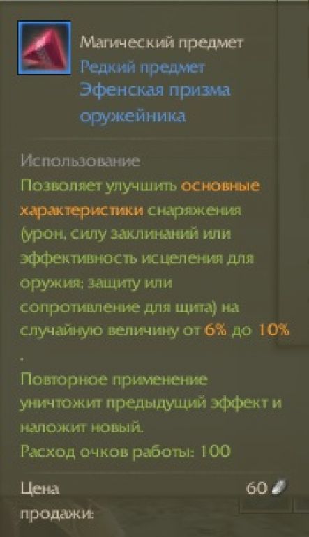 - Эфенская призма оружейника (30 вклада) — позволяет увеличить урон, урон от заклинаний или эффективность исцеления у оружия, а также защиту или сопротивление у щита от 6% до 10%.