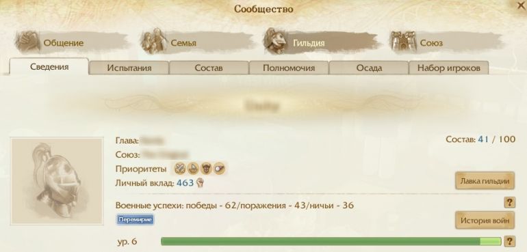 За выполнение испытаний гильдии начисляются очки опыта. Уровень гильдии влияет на эффект, который дается всем участникам. С каждым уровнем к предыдущим бонусам добавляется еще один.