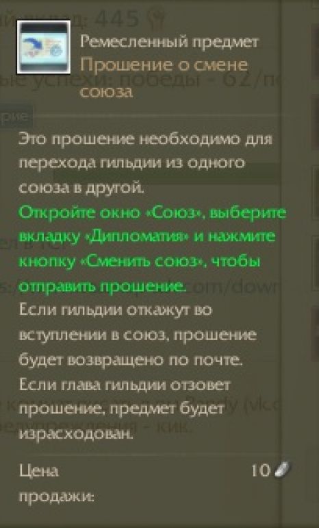 - Прошение о смене союза (2 000 вклада) — гильдия может стать частью пользовательской фракции, а после принятия прошения, гильдия не сможет вернуться в системную фракцию, но может перейти в другую пользовательскую фракцию с помощью этого же предмета.