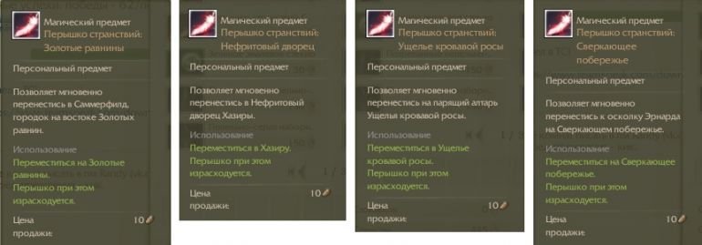 - Перышко странствий (2, 3 и 4 вклада) — позволяет мгновенно телепортироваться в Золотые равнины, Хазиру, Ущелье кровавой росы или на Сверкающее побережье.