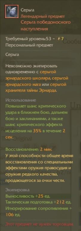 - Серьга победоносного наступления (2 000 вклада) — эту серьгу нельзя одеть вместе с серьгой из Библиотеки Эрнарда. После использования серьги увеличивается шанс критического удара и шанс критического эффекта исцеления на 35% в течение 2 секунды, а также дает 25 единиц к выносливости, 212 единиц к тактической подготовке и 106 единиц к игнорированию сопротивления.