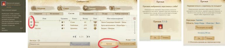 При использовании необходимо стоять на месте и не использовать никаких навыков, так как если отменить каст призыва (каст идет одну минуту), то призываемый игрок при нажатии «ОК» не сможет телепортироваться. Для его использования нужно выделить в составе гильдий игроков, а после нажать кнопку «Призыв». Количество игроков, которых можно призвать ограничено в соответствии с уровнем:
