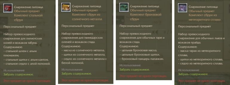 - комплект сбруи из метеоритного сплава (для горных, снежных и степных львов, Вихря, Урагана, Тайфуна и Химериона).