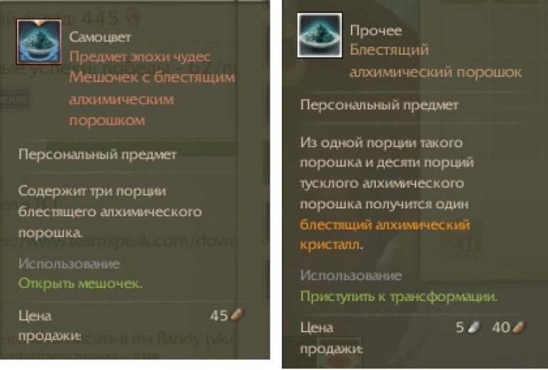 - Мешочек с блестящим алхимическим порошком (20 вклада, три штуки) — требуется для синтеза уникального костюма или нижнего белья.