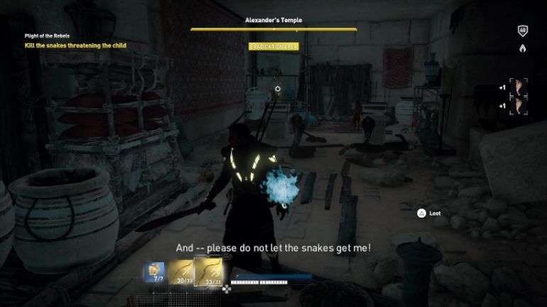 Байек должен освободить заключённых, которые томятся во вражеском лагере. Освободите двух мужчин, выведите их из лагеря и поговорите с ними. После этого вам нужно пойти с одним из них на поиски ребёнка. Вы достигните места, где нужно провести расследование. Изучите ветви, скамью, детскую обувь, бельё и балку, которая блокирует вход на склад. Используйте Сену, чтобы найти скрытый вход. Идите туда, ныряйте и плывите до цели. Ребёнок будет окружен змеями. Убейте их и поговорите с мальчиком. После этого выходите со склада и идите к Себни. Его атакуют солдаты. Убейте их и поговорите с мужчиной. Он даст вам два задания. В первом вам нужно вытащить ребёнка из вражеской цитадели. Идите туда, прыгайте на тележку и добирайтесь до лагеря. Мальчик прячется в сене позади телеги. Во втором задания вам нужно найти и убить повстанца. Миссия закончится после выполнения этих двух заданий.