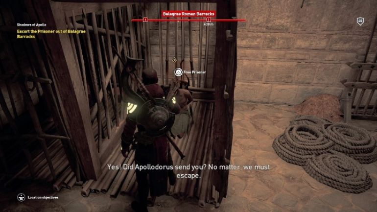 Этого узника можно найти в римских казармах. Уничтожьте охрану и выведите пленника из лагеря. Поговорите с ним для завершения задания. Да, вот такое короткое задание. Пришёл, увидел, победил.