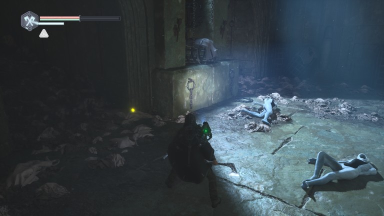 Находится неподалеку от запертой двери, пропустить его практически нереально. Пройдя через большие створки, вы столкнетесь с двумя врагами. После боя посмотрите влево — медальон (желтая сфера) лежит в углу комнаты.