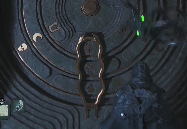 Вам нужно найти несколько табличек со странными символами и использовать дрона для их расшифровки. Затем поднимитесь к двери и правильно расположите символы (от внутреннего кольца к внешнему):