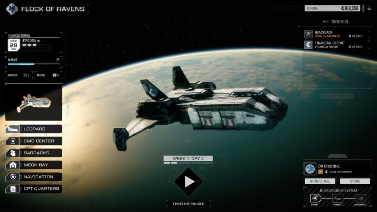 В левом верхнем углу у вас расположен календарь, ваше финансовое состояние (расходы на месяц), количество технических (Mechtech — влияет на производство) и медицинских очков (Medical — влияет на выздоровление), а также шкала морали экипажа. В правом верхнем углу отражен ваш общий бюджет, а также окно для сообщений и событий. Но нас интересуют вкладки, и что они означают.
