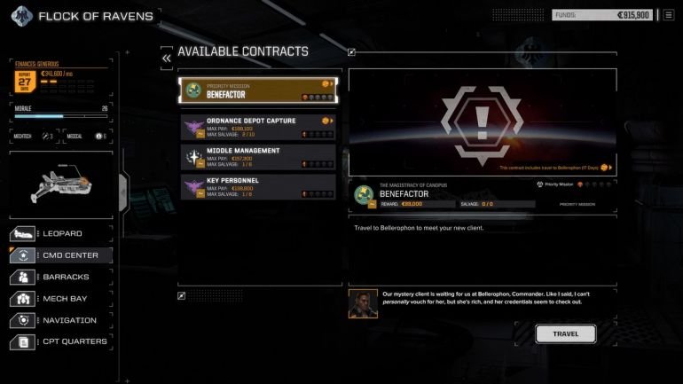 СMD CENTER — командный пункт. Здесь мы можем выбирать доступные контракты. Сложность их определяется линейкой черепов под ними (полчерепа — самый легкий тип). В контрактах указывается сумма отплаты в деньгах, а также количество трофеев (Max salvage), которые вы можете поднять с поля боя (первая цифра — выбираете вы, вторая цифра — получаете случайно). При принятии заказа вы можете ползунками настроить соотношение получаемых денег и трофеев. Если заказ помечен круглым золотым глобусом, то в стоимость включат бесплатный перелет до системы. В самом листе контракта можно узнать задачи миссии (захват базы, охрана конвоя и т. д.), и даже биом, в котором придется действовать. Более высокая репутация открывает доступ к более сложным и дорогим контрактам.