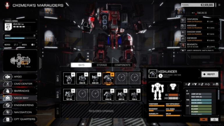 MECH BAY — здесь мы манипулируем теми мехами, которые стоят в ангаре. Вкладка Bays показывает нам мехов, уже готовых к активным действия. Но есть еще и Storage, импровизированный склад, на котором упакованы резервные мехи. В таком состоянии они практически не занимают ячейки, которых всегда ограниченное количество. Если кликнете по меху, то сбоку выедет его окно, в котором отразятся его характеристики и функционал. Здесь вы можете настроить вашу машину на любой вкус (Refit), поменять ей внешний вид (Pattern), или вовсе разобрать на кредиты (оранжевая кнопка). Про компоновку мехов мы напилим отдельный гайд, так как это отдельный и обширный пласт геймплея. После раздачи приказов, которые делаются не сразу, вы можете отслеживать их во вкладке Task Management — менять приоритет, или отменять их.