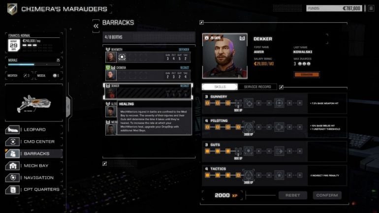 BARRACKS — казармы, где тусуются ваши мехвариоры. Вы не только отслеживаете их состояние, но и проводите прокачку навыков. После клика на пилота сбоку появляется окно со статами, где можно посмотреть перки (Attributes), справочную информацию (Battle stats). Во вкладке Skills на выбор четыре основных навыка: Gunnery (огонь из орудий), Piloting (управление мехом), Guts (здоровье) и Tactics (передвижение и выбор позиции).