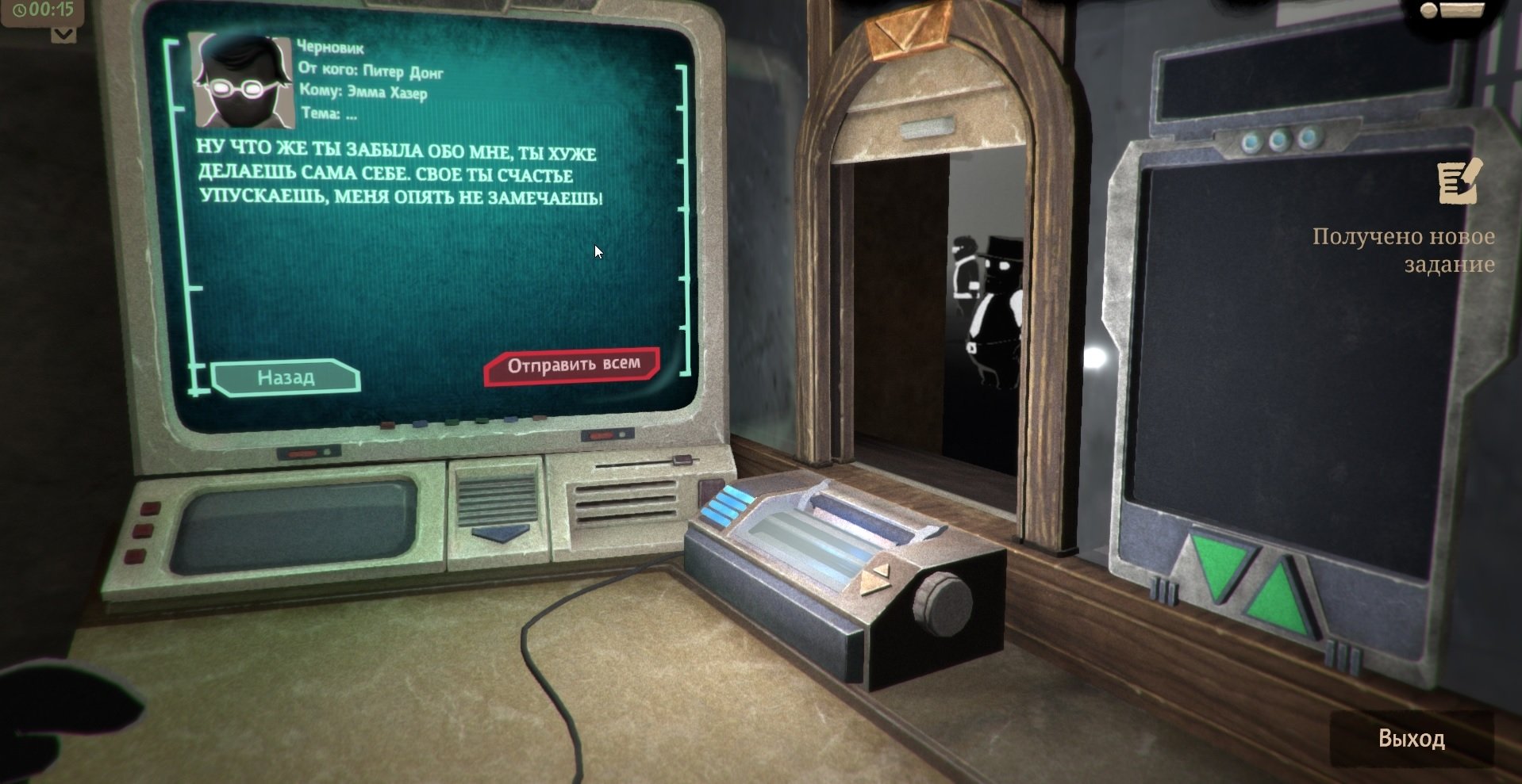Теперь вам необходим навык взлома ригельных замков. Как только навык будет получен, подойдите к его кабинке и дождитесь, когда Питер направится к Сирене Марвиц. Взломайте дверь в кабинку и садитесь за компьютер. Он подготовил черновик письма для Эммы Хазер. Все, что вам нужно сделать — отправить эту писанину всем работникам министерства. Донг будет публично наказан за массовую рассылку.