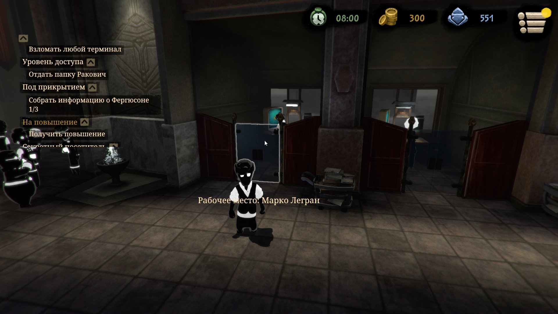 Чтобы продвинуться по «карьерной лестнице» совсем необязательно устранять конкурентов. Достаточно заработать 15 000 очков авторитета и подать заявку на повышение. Для этого выполняйте побочные квесты, а также работайте в усиленном режиме, обрабатывая запросы и выдавая бланки.