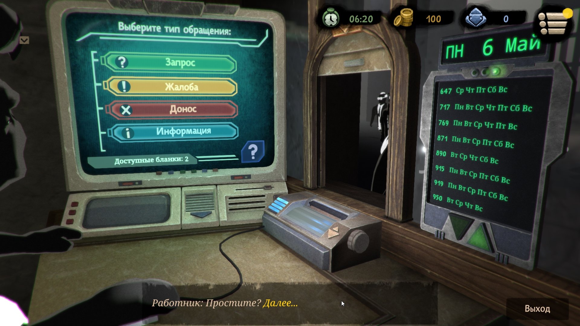 Совет: в игре по умолчанию работает функция автосохранения после каждого обработанного бланка. Поэтому, если вы направили посетителя в закрытый кабинет, указали неверную форму бланка или министерство — то можно загрузить только последнее ручное сохранение. Мы советуем вставать из-за рабочего места после каждого успешного выданного бланка и сохранять игру вручную.