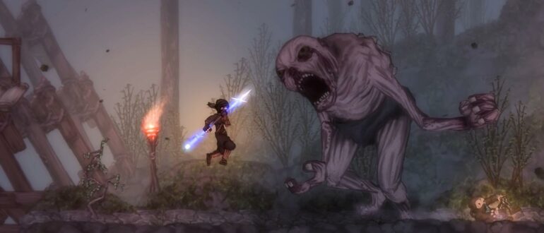 В начале игры бегите вперед вдоль берега и убивайте разных врагов, используя ЛКМ и ПКМ для легких и тяжелых ударов. Также используйте колесико мыши, чтобы зафиксироваться на цели.