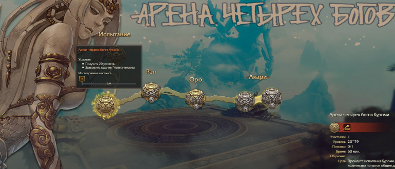 Арена четырех богов Куроми состоит из 12 основных этапов, которые необходимо пройти не более чем за 20 минут — за это дают опыт. В зависимости от результатов игрока