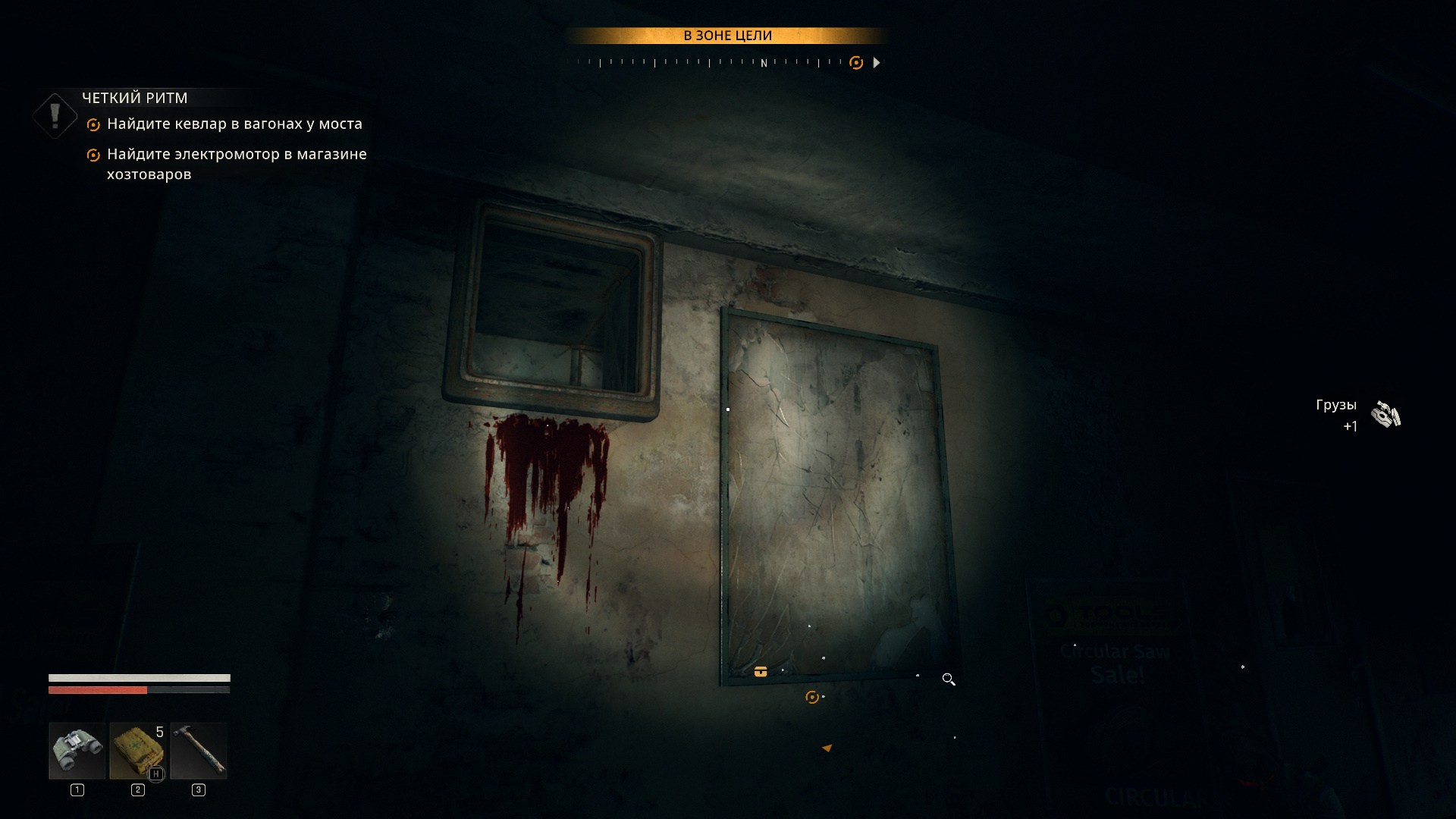 Отправляйтесь к магазину хозтоваров за электромотором. Проберитесь внутрь магазина через главный вход со стороны парковки. Идите в левый дальний угол, чтобы найти лестницу, ведущую на второй этаж. Поднимитесь и обнаружите заблокированную изнутри дверь. Слева от нее, вверху есть вентиляционное отверстие с пятнами крови.