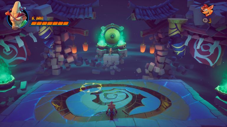 На новом этапе будет множество исчезающих платформ, а Кортекс начнет активировать маску Купуна-Ва. Следуйте вправо и убедитесь, что остаетесь на стабильных платформах. Периодически Кортекс будет замедлять время, но, если будете внимательны, особых проблем возникнуть не должно. Отскочите от крайнего левого Пифпафотрона, а затем прыгните в левый нижний угол. Ждите в этом месте, пока не начнется цикл падающих платформ, затем бегите к правой верхней турели и прыгайте на ней. Прыгните к ассистенту Кортекса и атакуйте его, чтобы положить конец манипуляциям со временем.