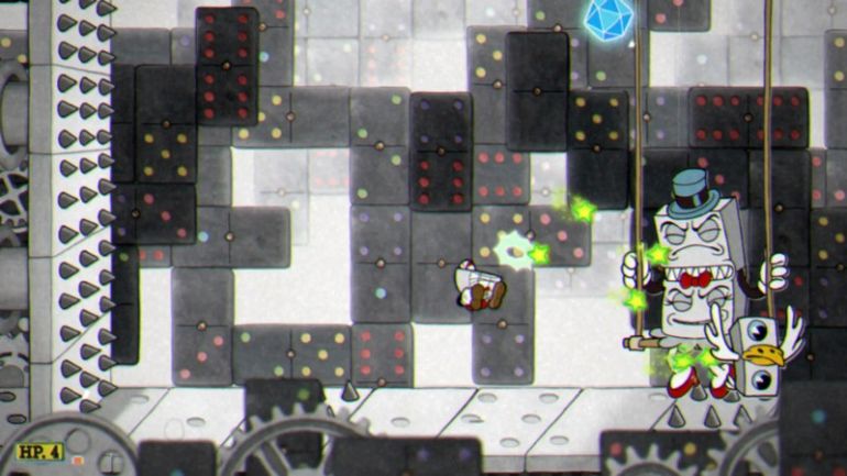 Когда начинается бой, немедленно подскочите и парируйте платформу. Когда рулетка начнет прыгать к вам, то перепрыгните ее и парируйте платформу, чтобы приземлиться. Еще одна атака, которую вы должны избегать — шары, падающие сверху. Дождитесь подходящего момента, чтобы проскочить под ними. Продолжайте стрелять и вскоре уничтожите противника.