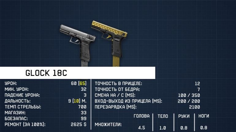 В декабрьском обновлении Warface за 2013 год был добавлен первый автоматический пистолет Glock 18C. И спустя 5 лет в игре появилась и его золотая версия. Определенным изменениям подверглись обе версии данного оружия: урон был значительно повышен, увеличилась точность в прицельном режиме, а также были скорректированы множители. В голову урон будет увеличиваться не в пять раз, а на 4,5, однако вместе с этим были подняты множители в ноги из 0,6 до 0,8.