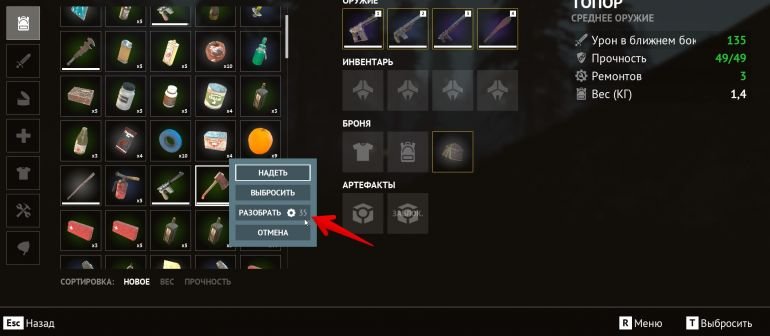 Чтобы разобрать тот или иной предмет на детали, вам нужно достичь определенного уровня и прокачать умение «Это не мусор!» в разделе «Перки». После этого вы сможете изучить навык «Эксперт мусорщик», для более эффективного разбора различных предметов. Просто нажмите правой кнопкой мыши на нужный предмет и выберите «Разобрать».