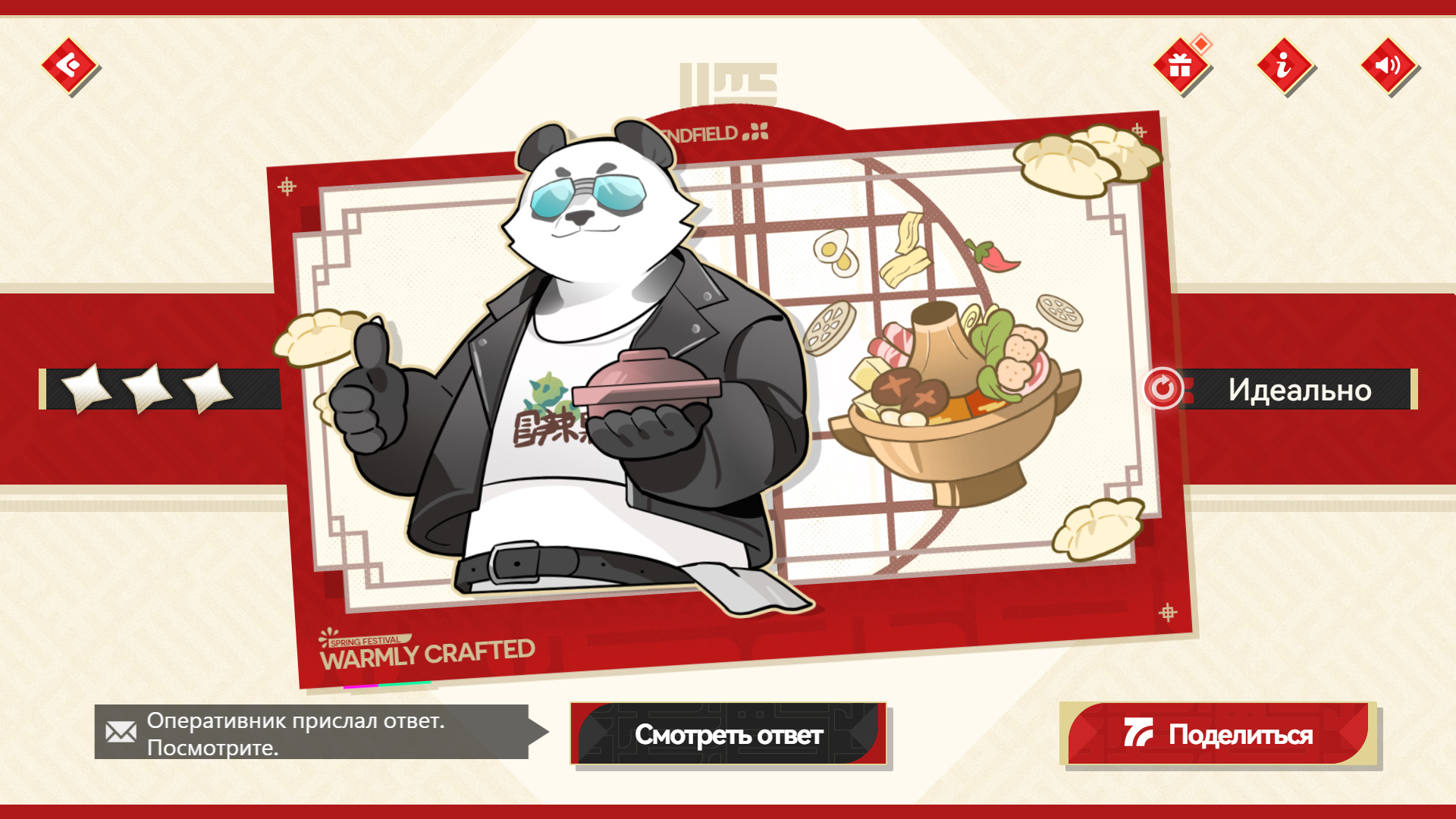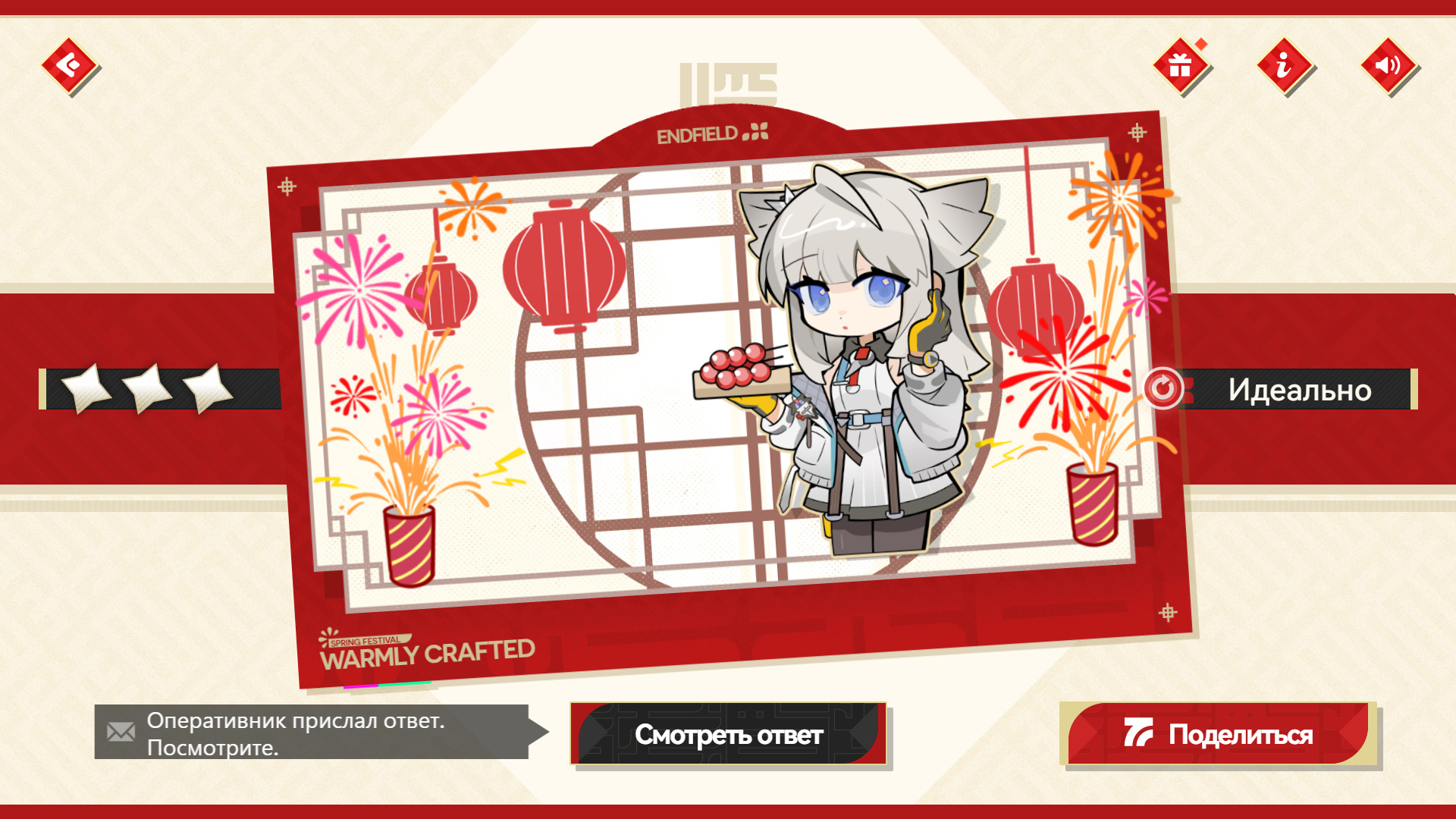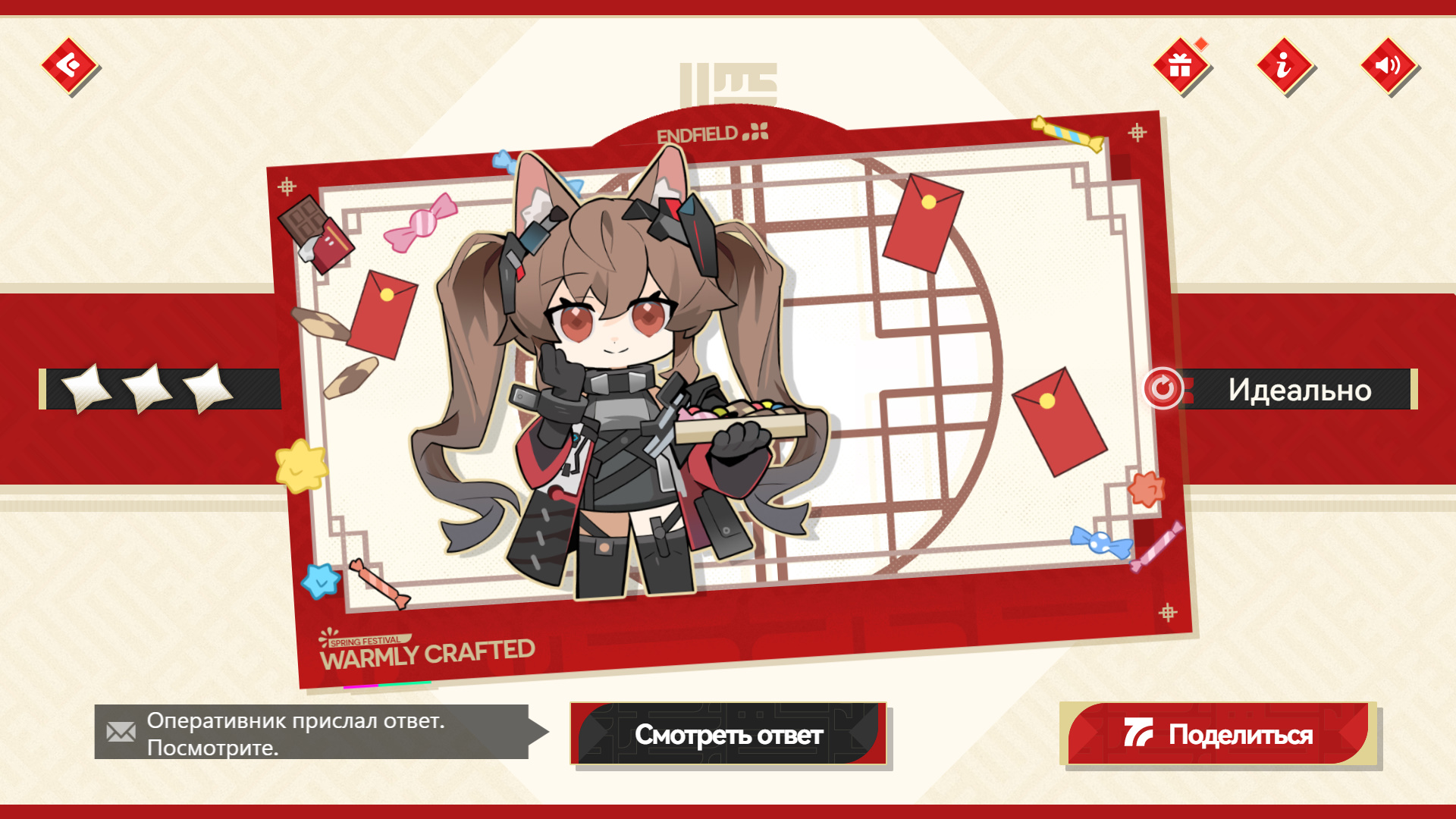 Создавайте открытку для каждого оперативника, подбирая декорации и изображения в соответствии с его личными предпочтениями, чтобы получать 3 звезды. Когда пройдете три этапа, откроется режим «Творчество». Создайте любую желаемую открытку и нажмите на кнопку «Поделиться», чтобы получить дополнительную награду — 18 888 Т-кредов.