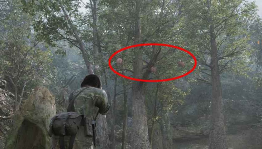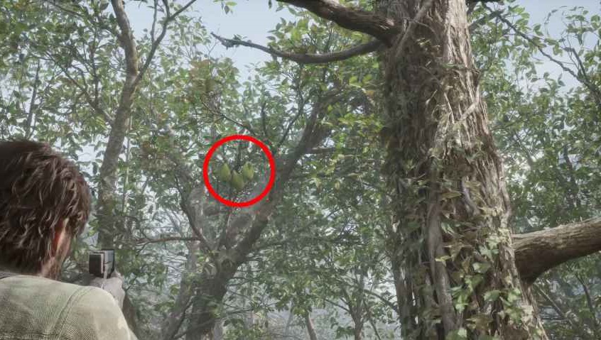 Фрукт A (Молочное яблоко) — двигайтесь на север от входа, минуя фрукт C. На дереве в конце увидите красные плоды, похожие на большие яблоки. Там же патрулирует второй охранник.